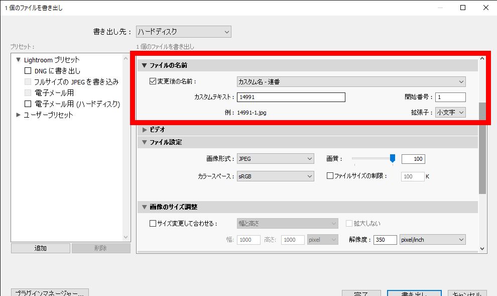 『カスタム名-連番』を選択、カスタムテキストには商品番号(ルースケースに貼ってある No.〇〇〇〇 のシール)を入力してください。