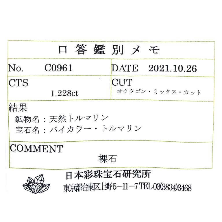◇オクタゴンカット◇バイカラートルマリンSA(宝石名バイカラー・トルマリン) ブラジル/アフリカ産 1.228ct ソ付(彩珠)[20129171]6.2×6.2mm前後