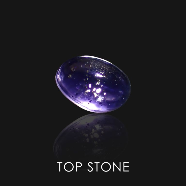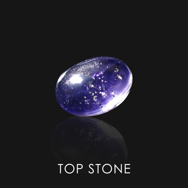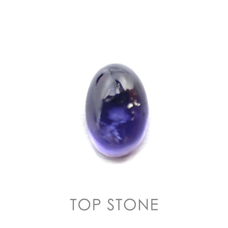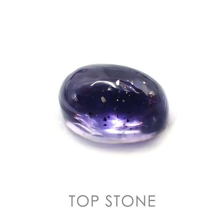 光の当たる角度や、ルースの傾きによって濃いブルーカラーのアイオライトの中に輝くラメラメがまるで宇宙のようにも見える奥行きのある見え方がとても印象的です。