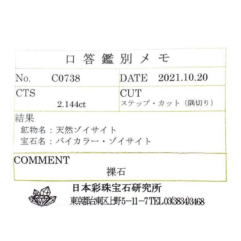 ゾイサイト(タンザナイト)は基本的に鑑別機関において加熱の過程を特定することが困難であり、非加熱検査ができない石種です。非加熱の文字を付けているものは、仕入れ元情報によるものです。