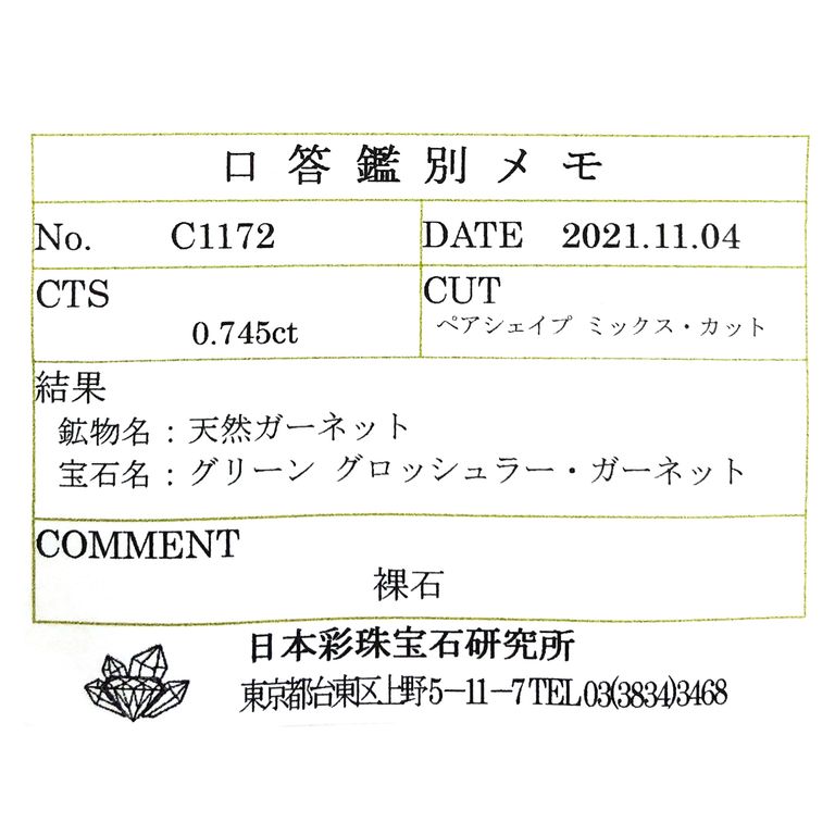 ★宝石の名前、鉱物の名前、サイズ、重さに加えて、屈折率、比重、分光特性、拡大検査結果などを写真付きでもっとその宝石を詳しく知りたい! → オススメ は 宝石鑑別書★国際的に通用する鑑別書が欲しい、宝石の産地(ルビー、サファイア、エメラルド、パライバトルマリン、レッドスピネル、アレキサンドライトのみ)が知りたい!→ オススメ は GIAの宝石鑑別書