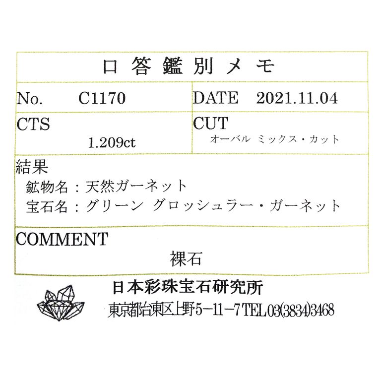 ★宝石の名前、鉱物の名前、サイズ、重さに加えて、屈折率、比重、分光特性、拡大検査結果などを写真付きでもっとその宝石を詳しく知りたい! → オススメ は 宝石鑑別書★国際的に通用する鑑別書が欲しい、宝石の産地(ルビー、サファイア、エメラルド、パライバトルマリン、レッドスピネル、アレキサンドライトのみ)が知りたい!→ オススメ は GIAの宝石鑑別書
