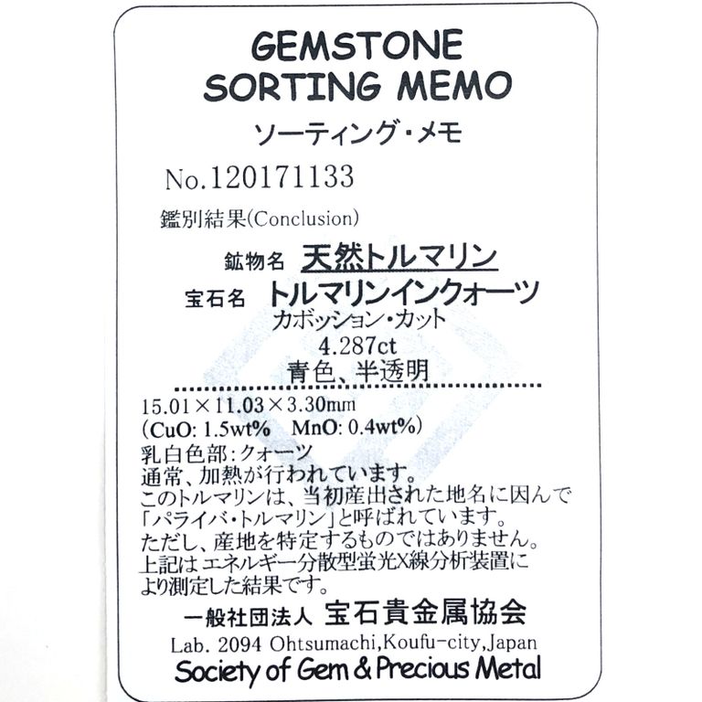 パライバトルマリンインクォーツ(宝石名トルマリンインクォーツ/別名パライバ・トルマリンインクォーツ) ブラジル産 4.287ct ソ付(宝貴協)[210510843]15.0×11.0mm前後