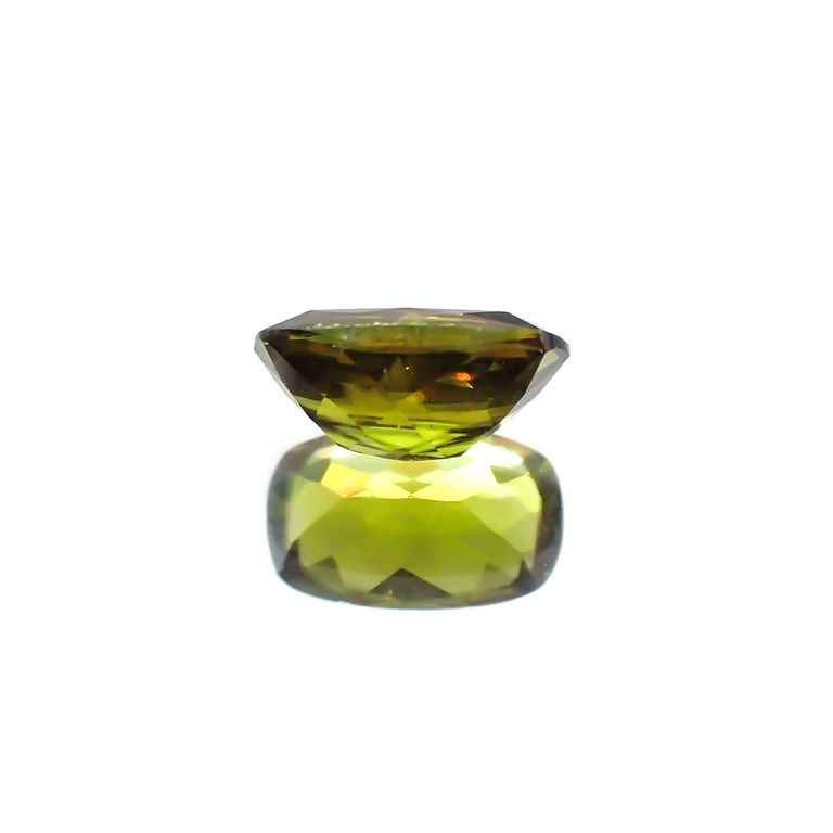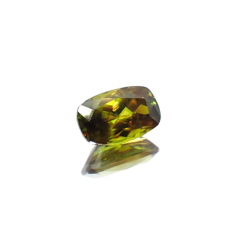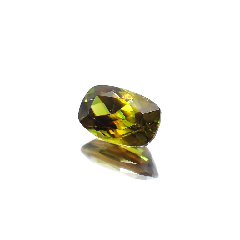 スフェーンは特に、このファイアが強く現れる宝石として知られています。光の分散率がダイヤモンドよりも大きく、また複屈折も大きいため、透明度の高いスフェーンのファセットカットはダイヤモンド以上の輝きを放つのです。