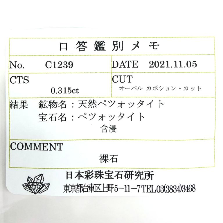 鑑別機関が宝石を鑑別した際に発行する簡易的な鑑別結果のことです。鑑別書のような冊子ではなく、小袋に鉱物名、宝石名、重さ、サイズ、開示コメントが記されているものになります。正しい宝石という鑑別機関のお墨付きが欲しい方に向いています。鑑別書と比べ、比較的費用は抑えられます。
