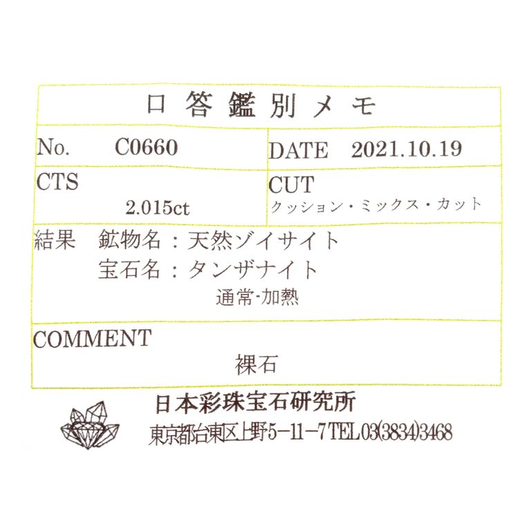 ゾイサイト(タンザナイト)は基本的に鑑別機関において加熱の過程を特定することが困難であり、非加熱検査ができない石種です。非加熱の文字を付けているものは、仕入れ元情報によるものです。