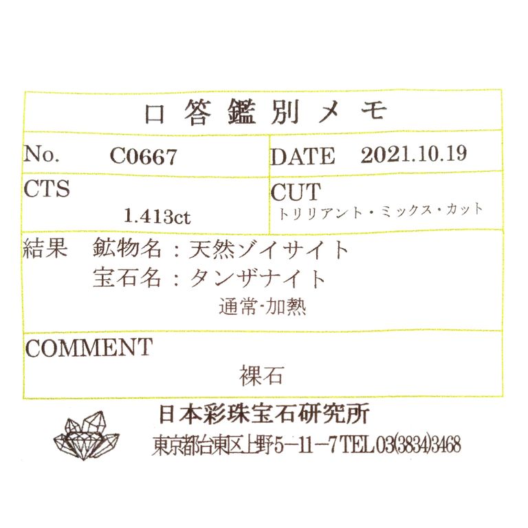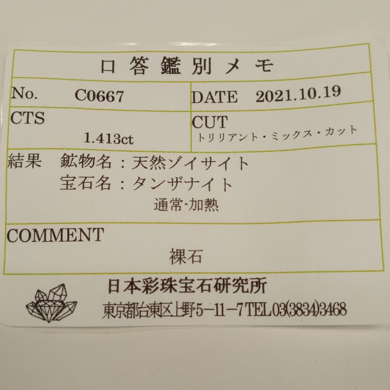 ゾイサイト(タンザナイト)は基本的に鑑別機関において加熱の過程を特定することが困難であり、非加熱検査ができない石種です。非加熱の文字を付けているものは、仕入れ元情報によるものです。