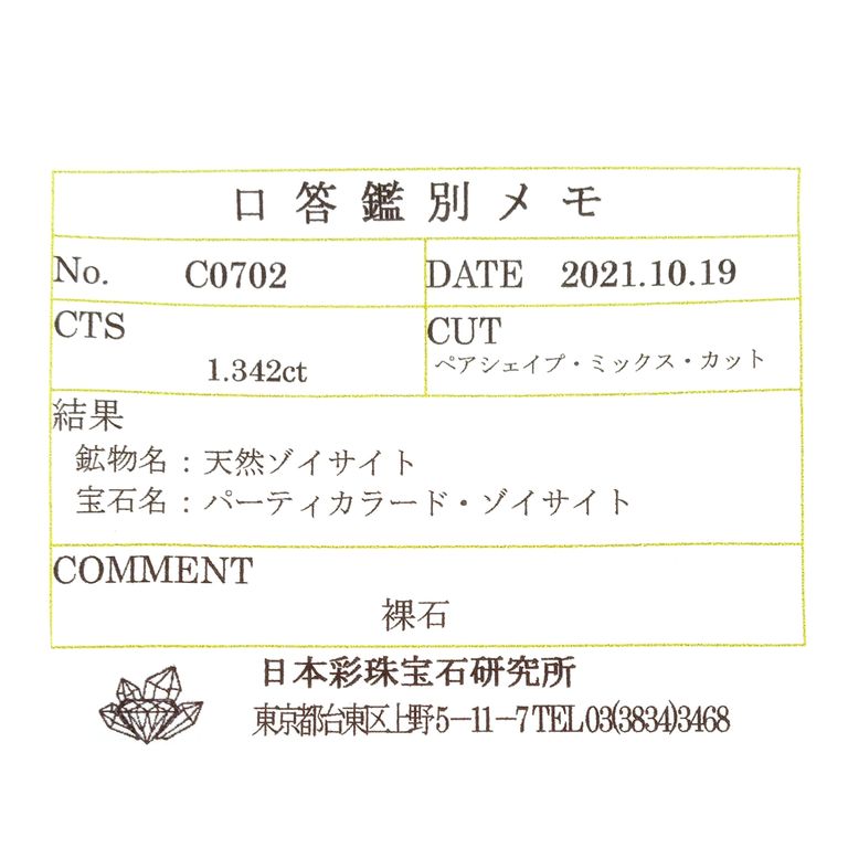 ゾイサイト(タンザナイト)は基本的に鑑別機関において加熱の過程を特定することが困難であり、非加熱検査ができない石種です。非加熱の文字を付けているものは、仕入れ元情報によるものです。