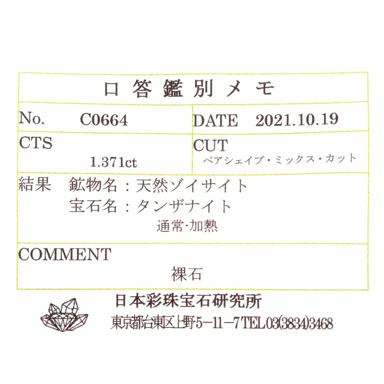 ゾイサイト(タンザナイト)は基本的に鑑別機関において加熱の過程を特定することが困難であり、非加熱検査ができない石種です。非加熱の文字を付けているものは、仕入れ元情報によるものです。
