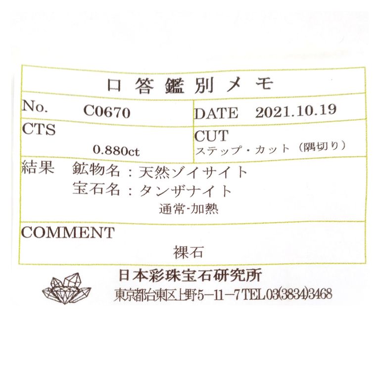 ゾイサイト(タンザナイト)は基本的に鑑別機関において加熱の過程を特定することが困難であり、非加熱検査ができない石種です。非加熱の文字を付けているものは、仕入れ元情報によるものです。