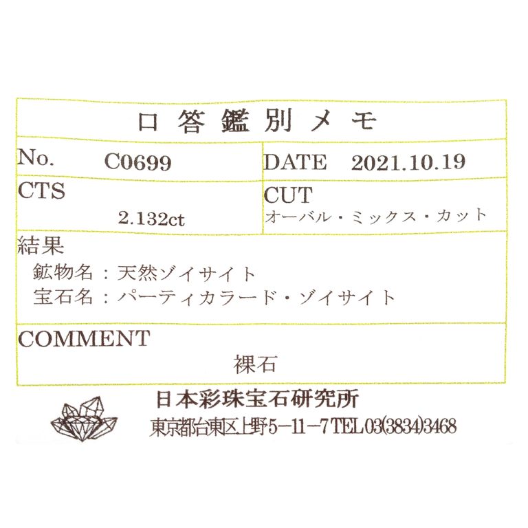 ゾイサイト(タンザナイト)は基本的に鑑別機関において加熱の過程を特定することが困難であり、非加熱検査ができない石種です。非加熱の文字を付けているものは、仕入れ元情報によるものです。