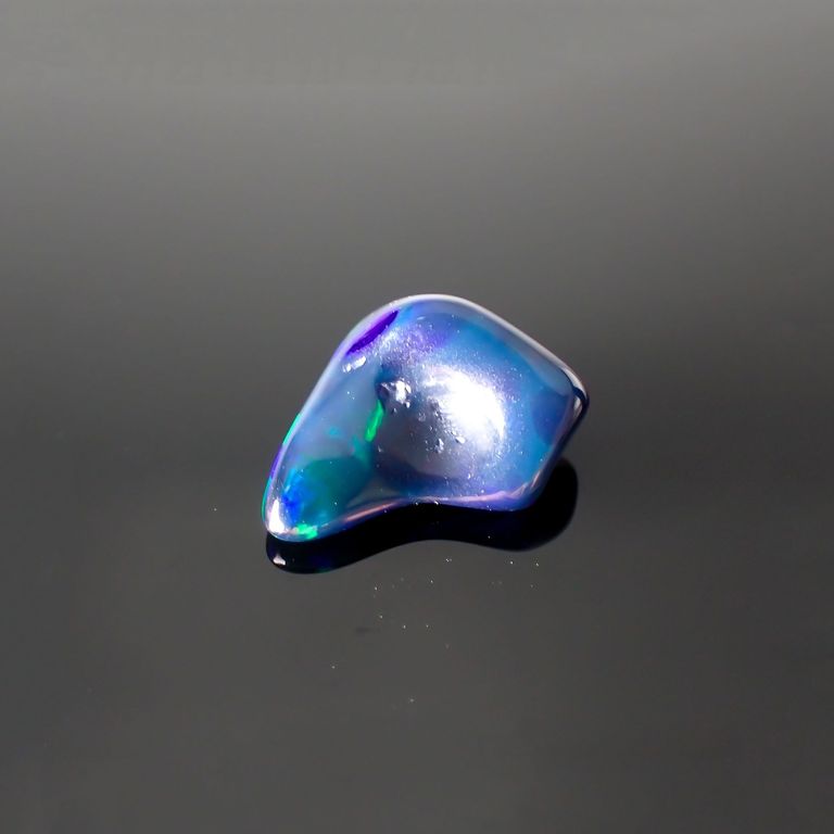オパールの遊色効果は、オパールの成分である珪酸と水の粒子がきちんとそろっていることが現れる条件です。さらに、その粒子の大きさによって現れる光の色合いが変わり、一番小さな粒子が紫、次いで青→緑→黄→オレンジ、そして一番大きなものが赤です。