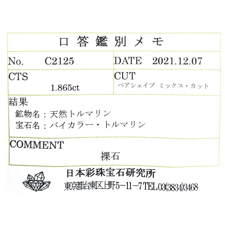 AGL加盟団体においてはパライバトルマリンは鑑別書+分析報告書の添付が必要になり高額となるため、口答鑑別(ソーティング)でCu(銅)とMn(マンガン)の数値を記載していただける一般社団法人宝石貴金属協会に依頼しております。
