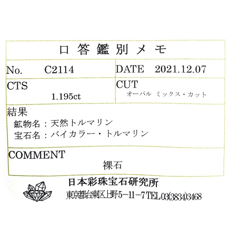 バイカラートルマリン(宝石名バイカラー・トルマリン) コンゴ民主共和国産 1.195ct ソ付(彩珠)[211013598]8.1×6.2mm前後