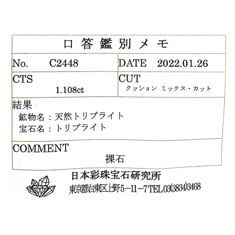 鉱物名、宝石名、重さ、サイズ、開示コメントだけでなく、写真や屈折率、比重など細かい項目が記されており、ブック状になっています。ソーティングに比べて費用は高くなりますが、より正確に細かくその石を知りたい、長期保存されたい方に向いています。