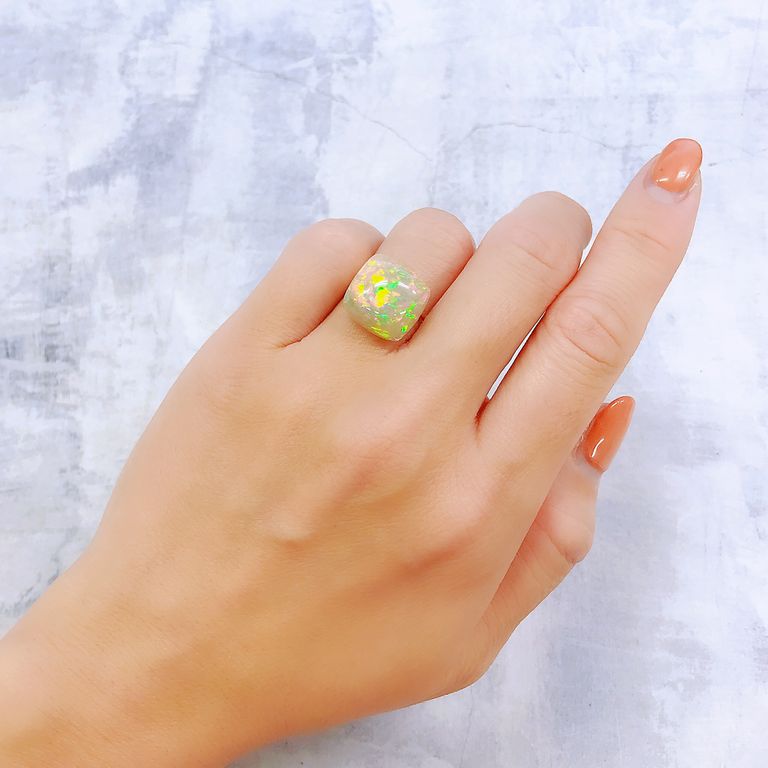 また、水につけたあとに乾かすと元に戻ります。何度も繰り返すことができますが、極度に乾燥させるとひびが入ったり、割れてしまったりすることもあります。一般的なオパールと同じように、お取り扱い・保管時の乾燥はご注意ください。