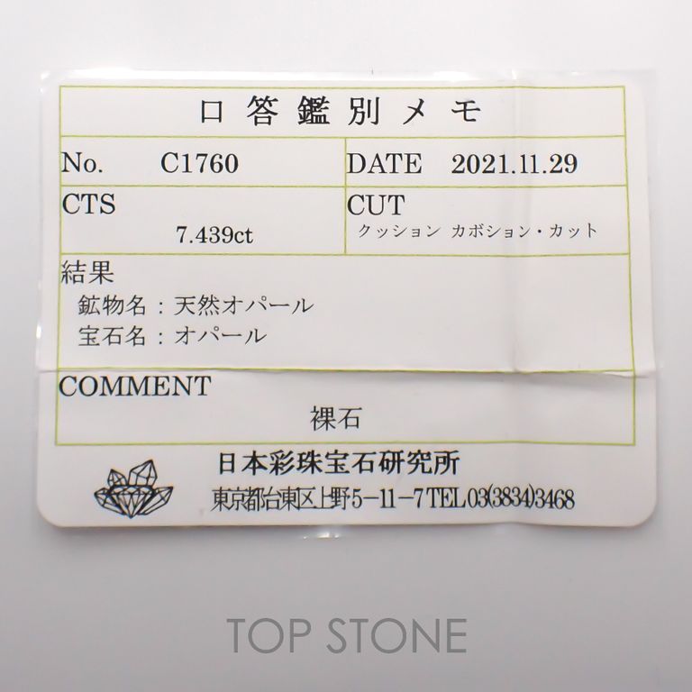 TOP STONEのルースは鑑別機関にてチェックを受け、商品名称との相違のないことを確認しております(一部抜き取り鑑別の商品あり。注1)。鑑別の種類は下記のいずれかのものとなります。
