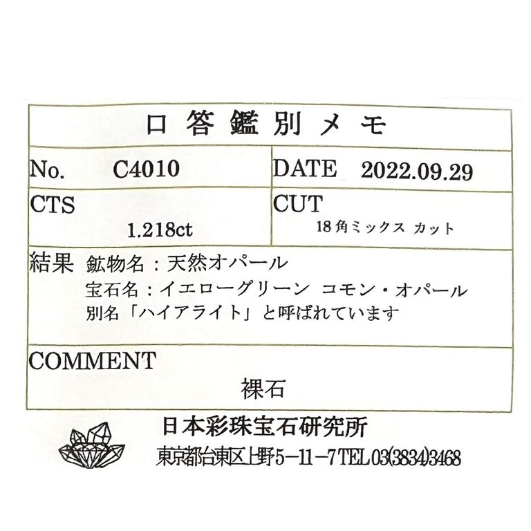 ハイアライトオパール(宝石名イエローグリーン コモン・オパール/別名ハイアライト)メキシコ産 ソ付(彩珠) 1.218ct / 9.9x5.7mm前後 [230119874]
