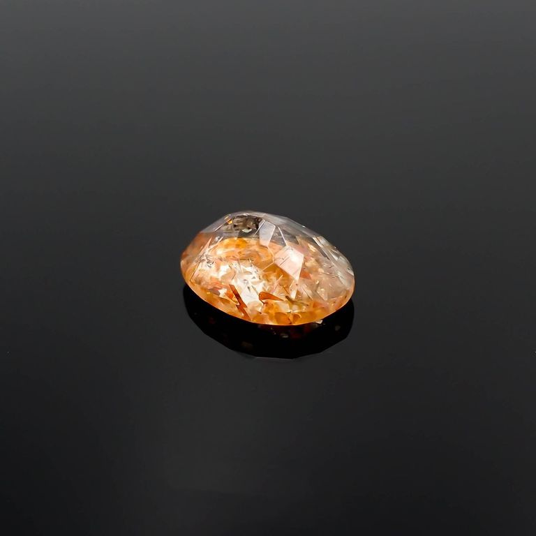 ややイエローがかったクリアなボディカラーの中に、オレンジや赤のラメ状インクルージョンがぎらりと輝くアベンチュリン長石、それがイリュージョンサンストーンです。