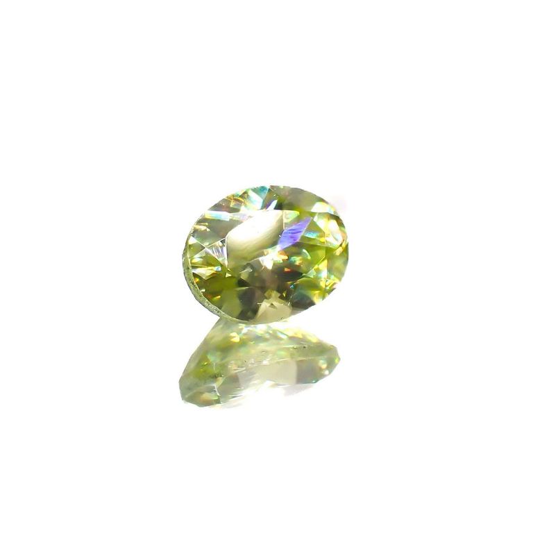 最大の特徴は、かなり強い虹色の輝きを放つことです。光が当たるとイエローやオレンジ、グリーンなど、宝石自体の持つ色とは別に、様々な色の光が溢れます。これが『ファイア』と呼ばれる、いわゆる宝石のきらめきであり、カラーレスのダイヤモンドが華やかに輝くのはこのためです。