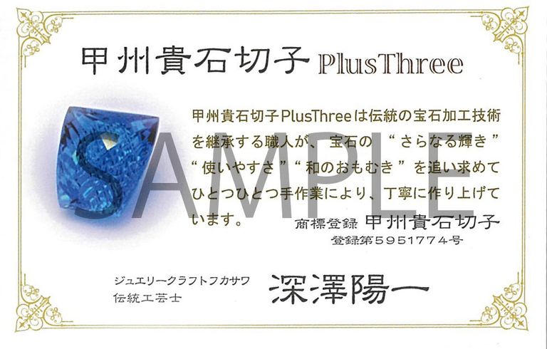「甲州貴石切子 Plus Three」には、伝統工芸士である、ジュエリークラフトフカサワの深澤陽一さんによる作品を証明する【ギャランティカード】をお付けしてお届けいたします。