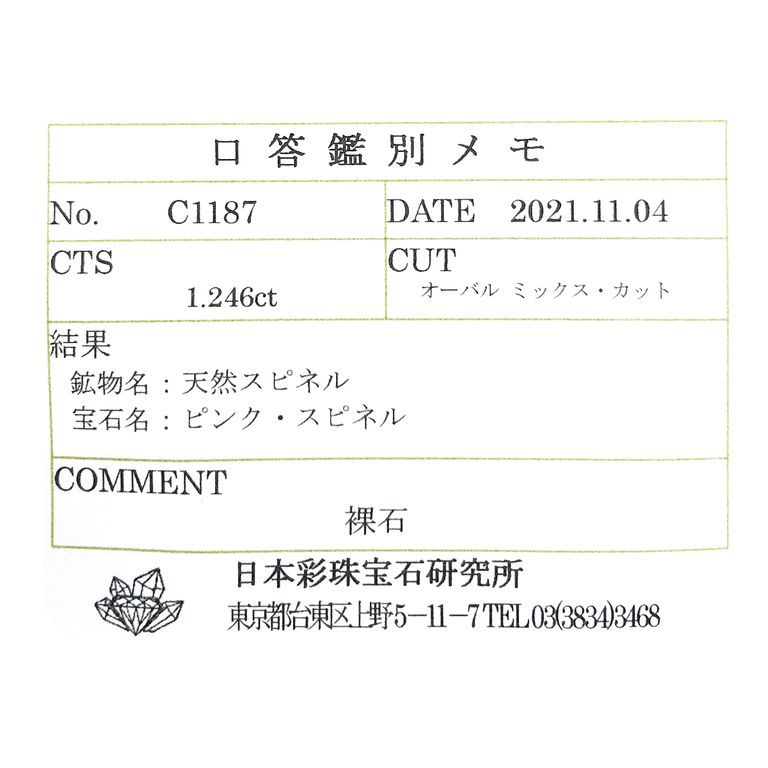 ★宝石の名前、鉱物の名前、サイズ、重さに加えて、屈折率、比重、分光特性、拡大検査結果などを写真付きでもっとその宝石を詳しく知りたい! → オススメ は 宝石鑑別書