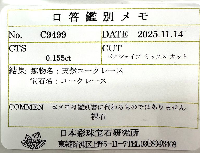 鑑別機関が宝石を鑑別した際に発行する簡易的な鑑別結果のことです。鑑別書のような冊子ではなく、小袋に鉱物名、宝石名、重さ、サイズ、開示コメントが記されているものになります。正しい宝石という鑑別機関のお墨付きが欲しい方に向いています。鑑別書と比べ、比較的費用は抑えられます。