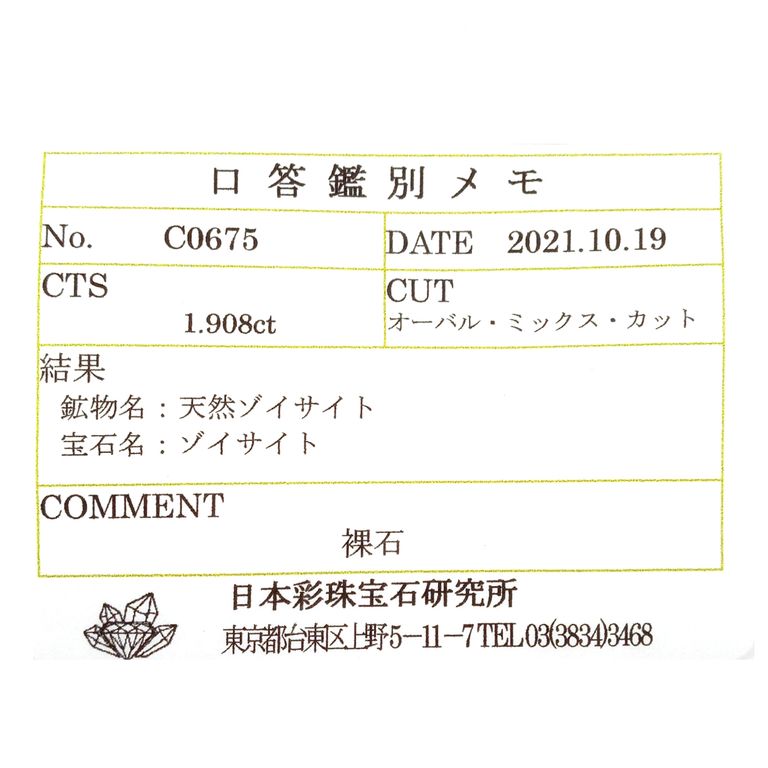 ゾイサイト(タンザナイト)は基本的に鑑別機関において加熱の過程を特定することが困難であり、非加熱検査ができない石種です。非加熱の文字を付けているものは、仕入れ元情報によるものです。