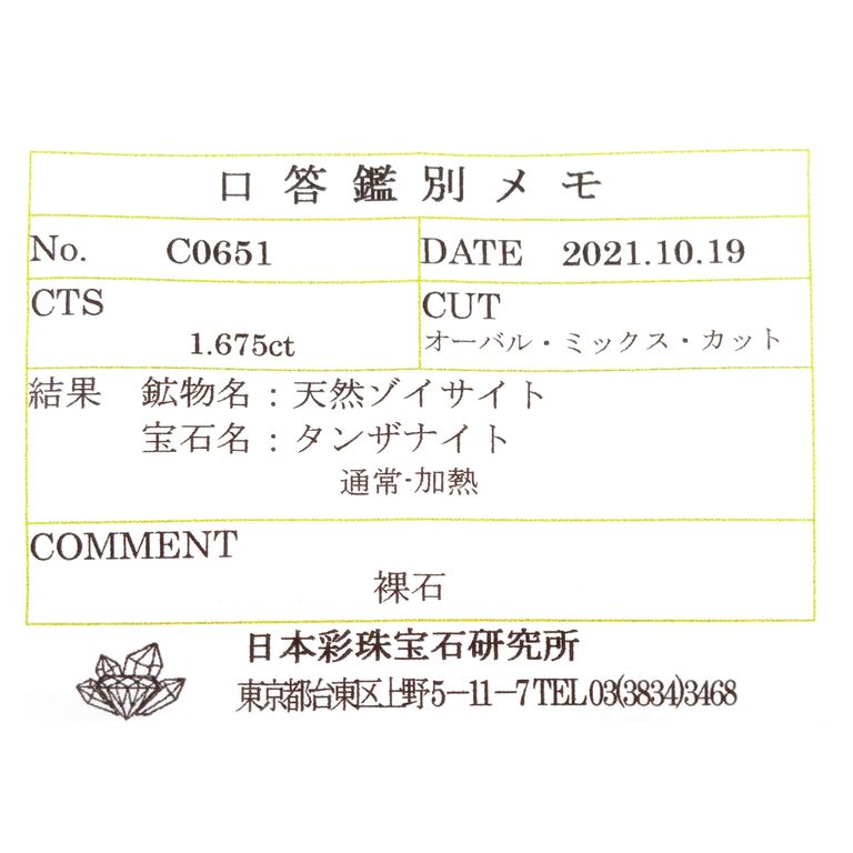 ゾイサイト(タンザナイト)は基本的に鑑別機関において加熱の過程を特定することが困難であり、非加熱検査ができない石種です。非加熱の文字を付けているものは、仕入れ元情報によるものです。