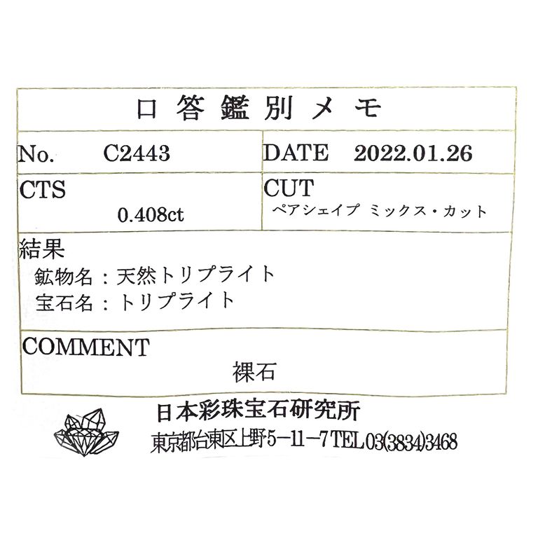 TOP STONEのルースは鑑別機関にてチェックを受け、商品名称との相違のないことを確認しております(一部抜き取り鑑別の商品あり。注1)。鑑別の種類は下記のいずれかのものとなります。