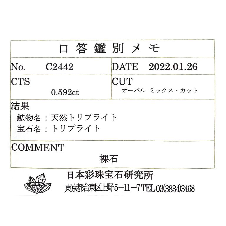 鉱物名、宝石名、重さ、サイズ、開示コメントだけでなく、写真や屈折率、比重など細かい項目が記されており、ブック状になっています。ソーティングに比べて費用は高くなりますが、より正確に細かくその石を知りたい、長期保存されたい方に向いています。