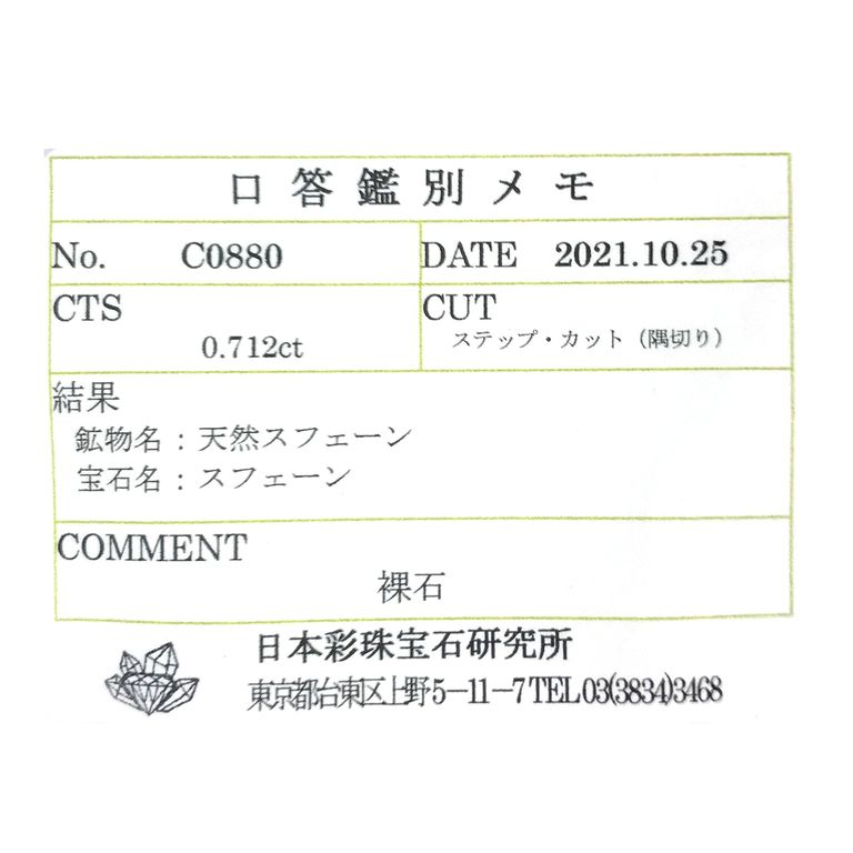 ★宝石の名前、鉱物の名前、サイズ、重さに加えて、屈折率、比重、分光特性、拡大検査結果などを写真付きでもっとその宝石を詳しく知りたい! → オススメ は 宝石鑑別書