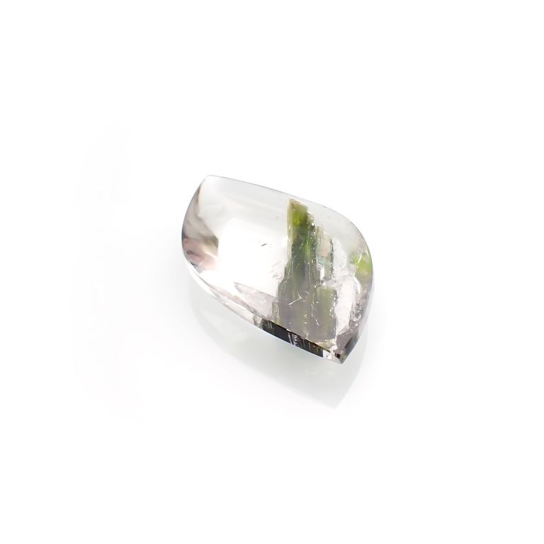 クォーツ(水晶)の中に、グリーントルマリンの柱状結晶を含んだルースです。不透明な母岩の共生ではなく、クリアな水晶の中にくっきりと浮かぶグリーントルマリン。このトルマリン部分の透明度も素晴らしく、どの角度からも標本のような美しい姿を楽しむことができます。