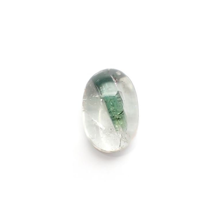 クォーツ(水晶)の中に、グリーントルマリンの柱状結晶を含んだルースです。不透明な母岩の共生ではなく、クリアな水晶の中にくっきりと浮かぶグリーントルマリン。このトルマリン部分の透明度も素晴らしく、どの角度からも標本のような美しい姿を楽しむことができます。