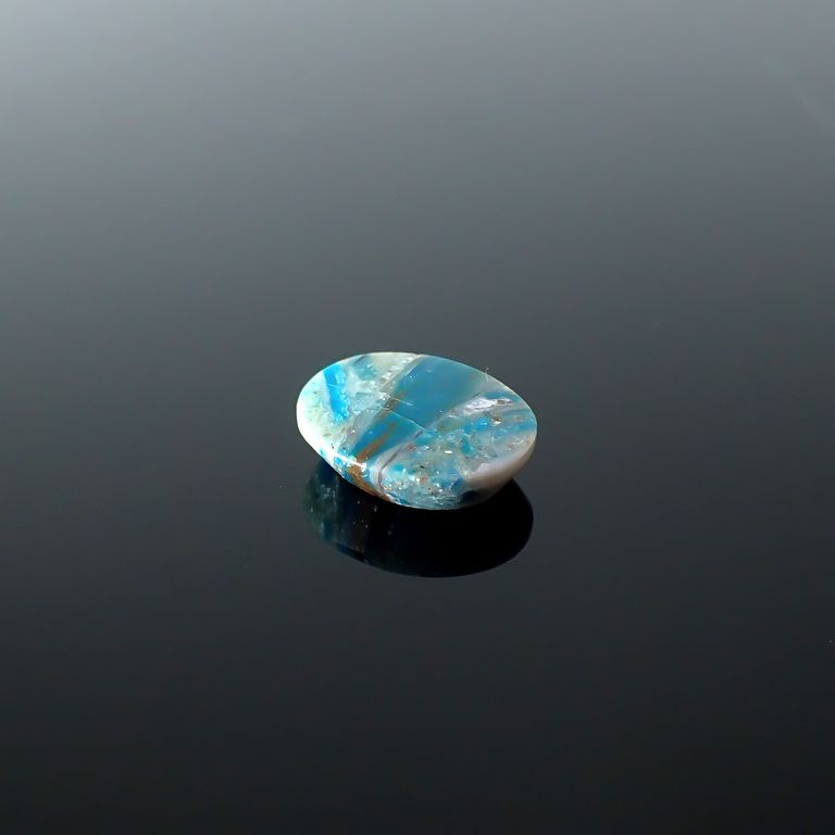 同じ鉱山からクリソコラやヘマタイトも同時に産出することからもわかるとおり、複数の鉱物を含んだ鉱脈で、ブルーオパールにもその片鱗がうかがえます。青一色のものから、鉄を含んで緑色に発色したもの、さらに黄色や白い部分などもあり、絶景が浮かぶペルー産のブルーオパールまさに絵画オパールと呼びたくなる美しさです。