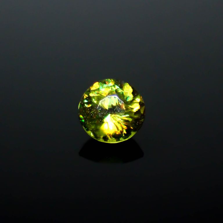 スフェーンは特に、このファイアが強く現れる宝石として知られています。光の分散率がダイヤモンドよりも大きく、また複屈折も大きいため、透明度の高いスフェーンのファセットカットはダイヤモンド以上の輝きを放つのです。