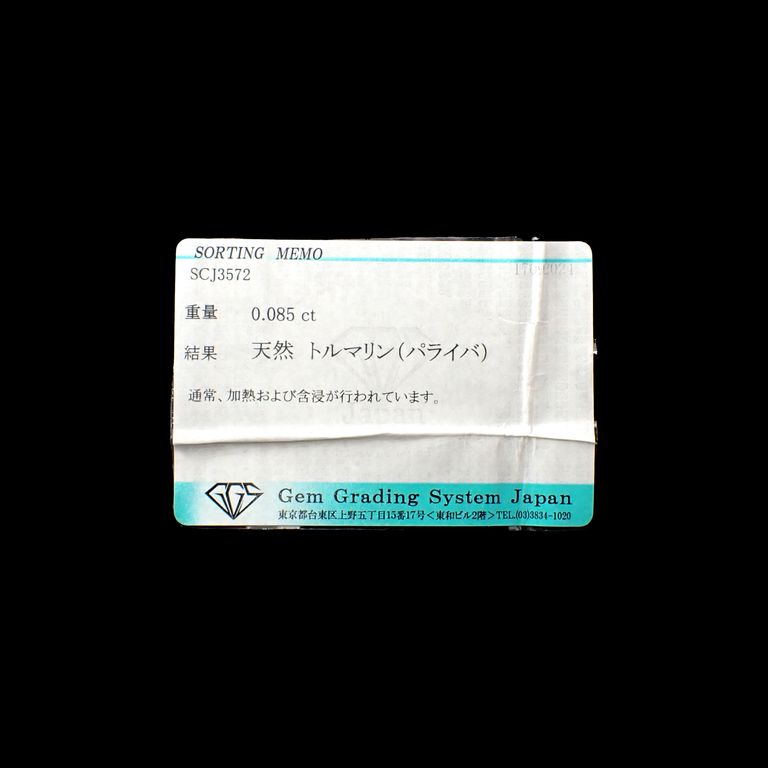 パライバトルマリン(宝石名トルマリン/別名パライバ・トルマリン)ブラジル・パライバ州バターリャ鉱山産 ソ付(GGS) 0.085ct / 3.7x2.7mm前後 [250931077]