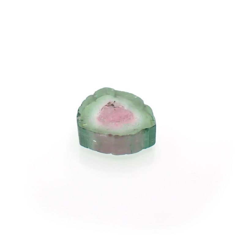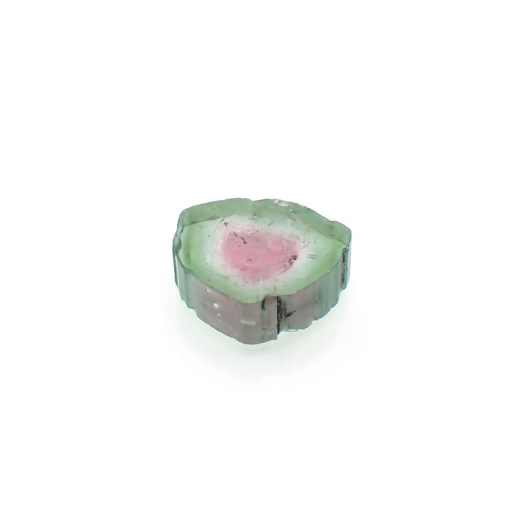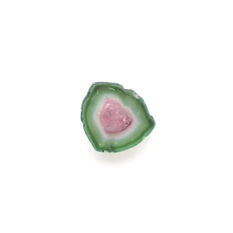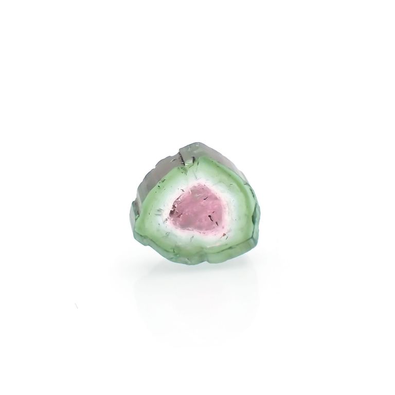 トルマリンの柱状結晶が出来上がる際、核となる内側のピンクの化粧がまず出来上がり、何らかの環境の変化によって、ピンクの発色要因となるイオンの供給が止まります。それに替わって、グリーンの発色要因となる元素が周囲にあつまり、グリーンの結晶がピンクを取り巻くように成長を続けると、結晶を輪切りにした時にスイカのように見える配色が出来上がるわけです。