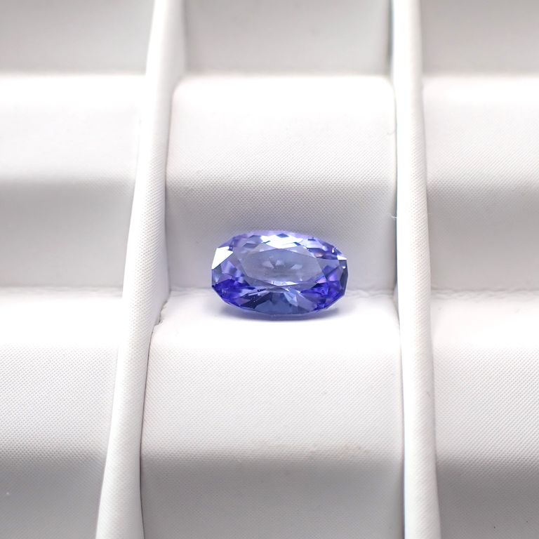 一般的にブルーのゾイサイト(タンザナイト)は加熱が施されていることの多い宝石です。もともと含まれていたバナジウムが加熱されることによってブルーの色が顕著に発現するようになるという特性を生かした手法で、褐色がかった結晶を加熱することで美しいバイオレットからブルーに変わります。