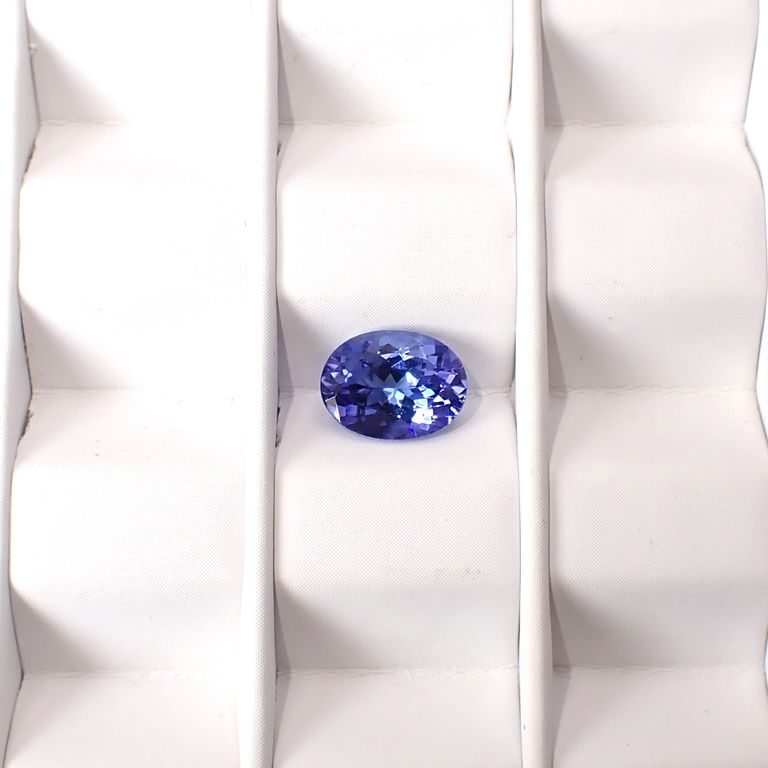 一般的にブルーのゾイサイト(タンザナイト)は加熱が施されていることの多い宝石です。もともと含まれていたバナジウムが加熱されることによってブルーの色が顕著に発現するようになるという特性を生かした手法で、褐色がかった結晶を加熱することで美しいバイオレットからブルーに変わります。