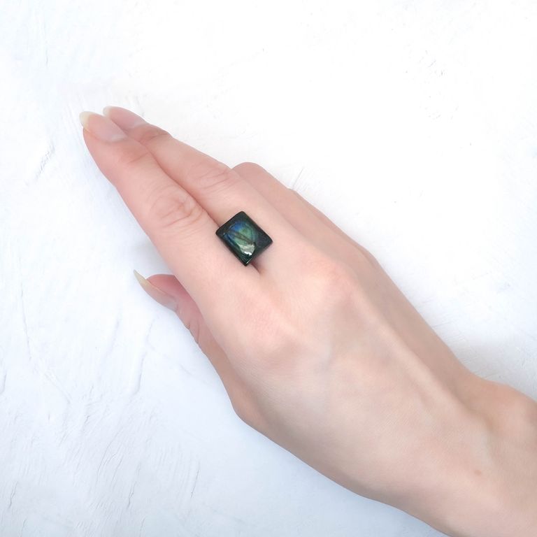 ちなみに、ラブラドライトという石は本来は黄色の透明な長石です。虹色の出るタイプはむしろ変種なのですが、発見された順が虹色を放つものの方が早かったため、『ラブラドライト=虹色の光を放つもの』というイメージが先行し、石種としては基本となるイエローの透明なタイプの方が、ゴールデンラブラドライトというあたかも変種のような名前で呼ばれている面白い裏話のある宝石です。