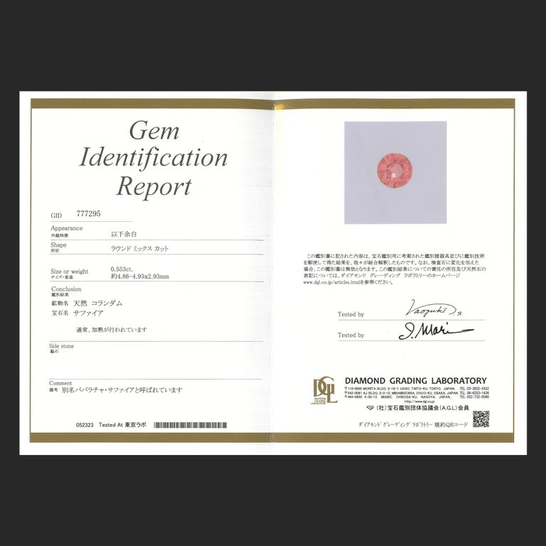 パパラチャサファイア(宝石名サファイア/別名パパラチャ・サファイア)スリランカ/マダガスカル産 DGL鑑付 0.553ct / 4.86x4.93mm前後 [251031289]