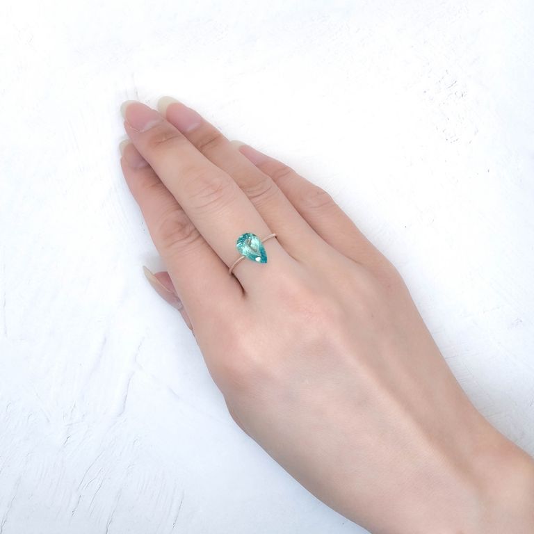 パライバトルマリンは含まれる成分や産地などの違いによって、美しく澄んだブルーから、優しいライトグリーン、またはネオンブルーに輝くものまでのカラーバリエーションがあります。トルマリングループの中の、リシア電気石(エルバイト/Eelbaite)に銅(Cu)が発色要因として含有された宝石で、含有量やそのほかに含まれるマンガン(Mn)の割合によって少しずつ色合いに違いが出ます。