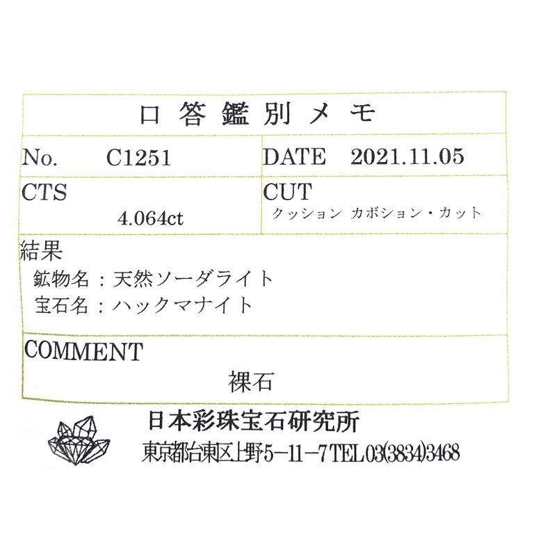 ハックマナイト(宝石名ハックマナイト) ビルマ産 ソ付(彩珠) 4.064ct / 11.1x9.4mm前後 [250712123]