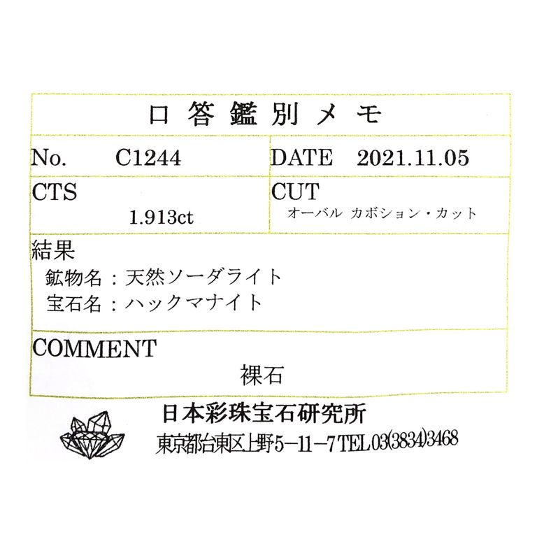 ハックマナイト(宝石名ハックマナイト) ビルマ産 ソ付(彩珠) 1.913ct / 9.2x7.4mm前後 [250712125]