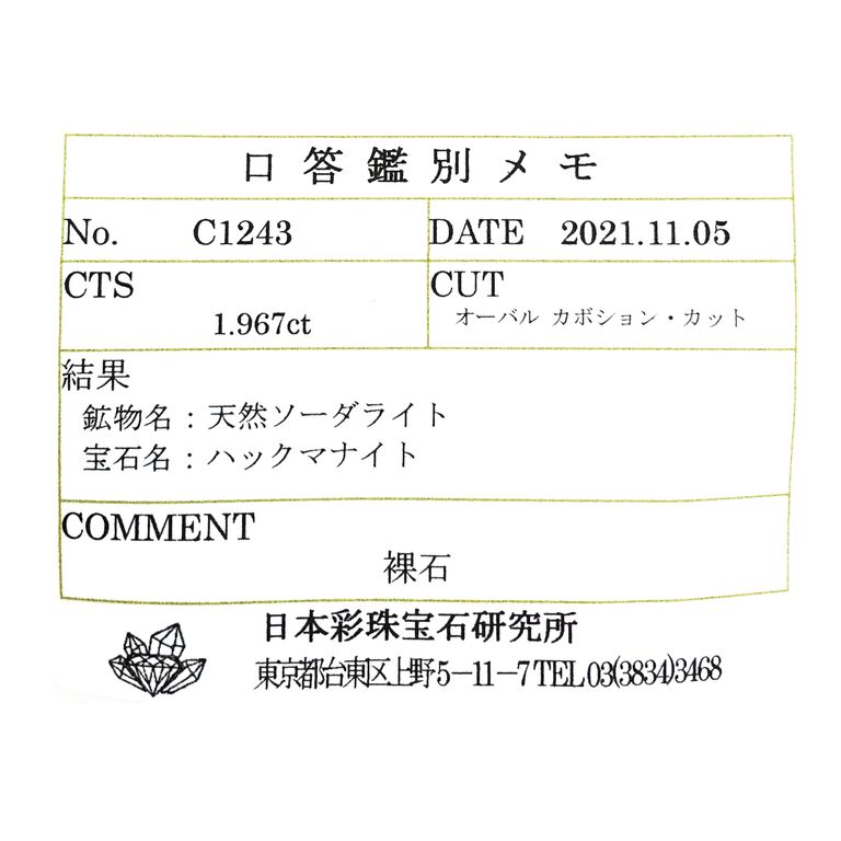 ハックマナイト(宝石名ハックマナイト) ビルマ産 ソ付(彩珠) 1.967ct / 9.1x8.6mm前後 [250712126]