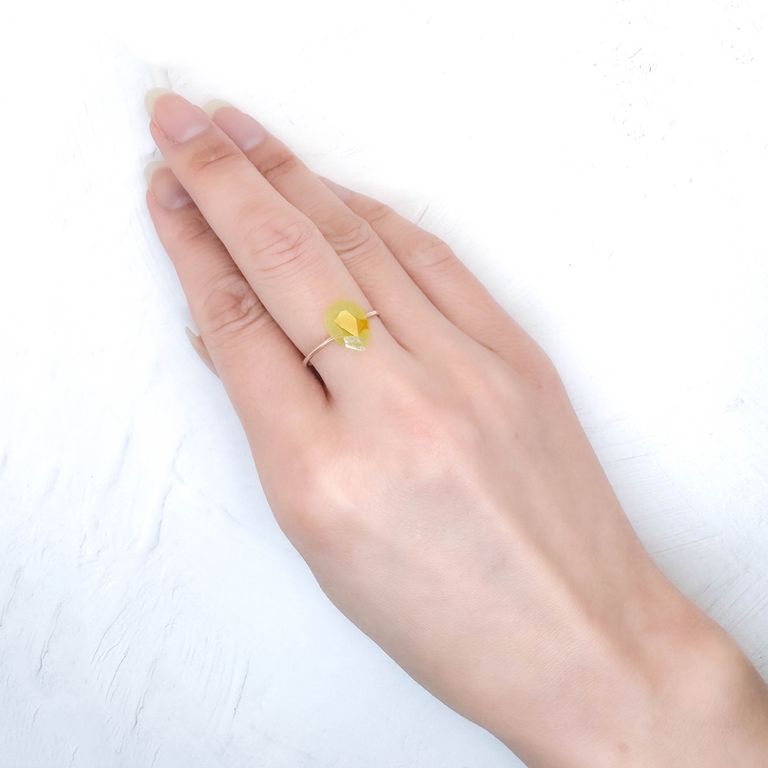次いで希少とされるのが鮮やかなイエロー。白色ライトを当ててみると、最も近い部分は半透明感が増して白色に近づき、まるで黄色い色合いが外へ外へと逃げていくかのように見えます。とっても不思議です。