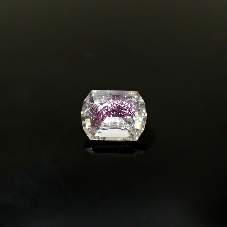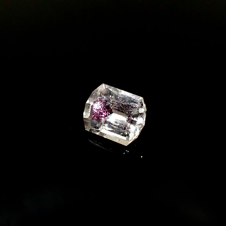 一見すると、水晶に黒っぽい粒が胡椒をふりかけたように点々と入っているようにしか見えないのですが、その点々がある角度になると驚くほど鮮やかなネオンピンクの閃光となって浮かび上がる石で、その美しさと希少性から、世界の原石マニアにとっては垂涎のコレクターズアイテムです。