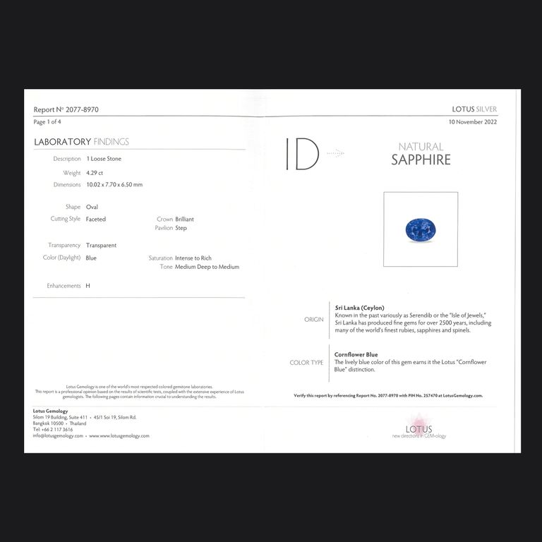 コーンフラワーブルーサファイア(宝石名サファイア/コーンフラワーブルー)スリランカ産 LOTUS鑑付 4.29ct / 10.02x7.7mm前後 [260131599]