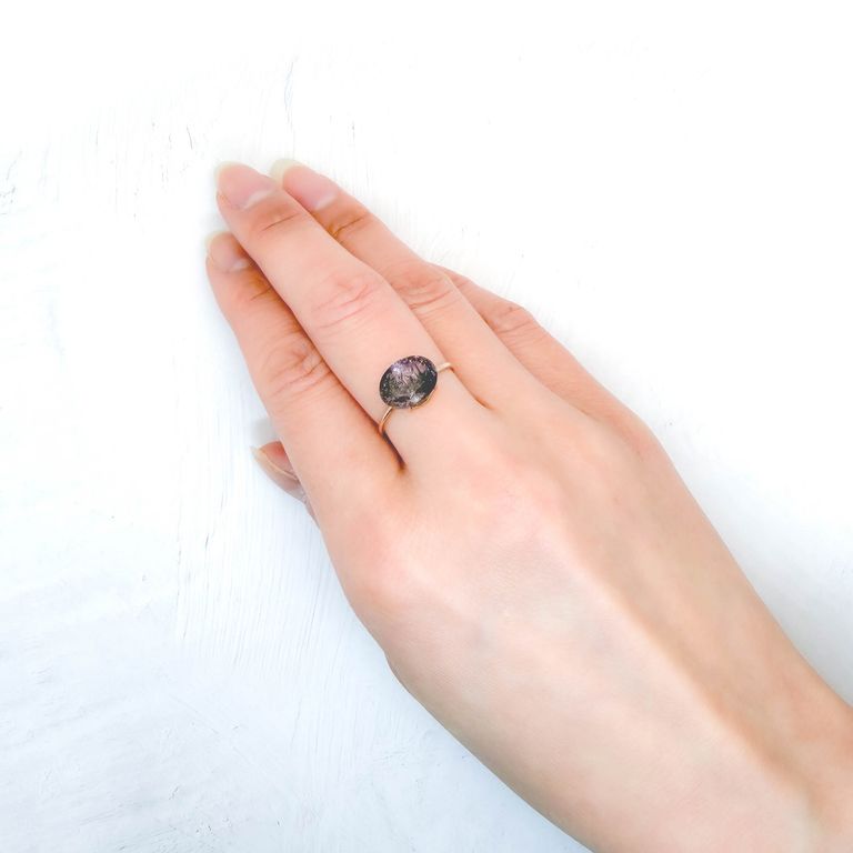 もうひとつはゲーサイトインアメジスト。アメジストの中に黄金色の小さなドライフラワーが入ったような見た目で、鉄系の鉱物であるゲーサイトの針状結晶がアメジストの中で美しく花開くように入ったタイプです。